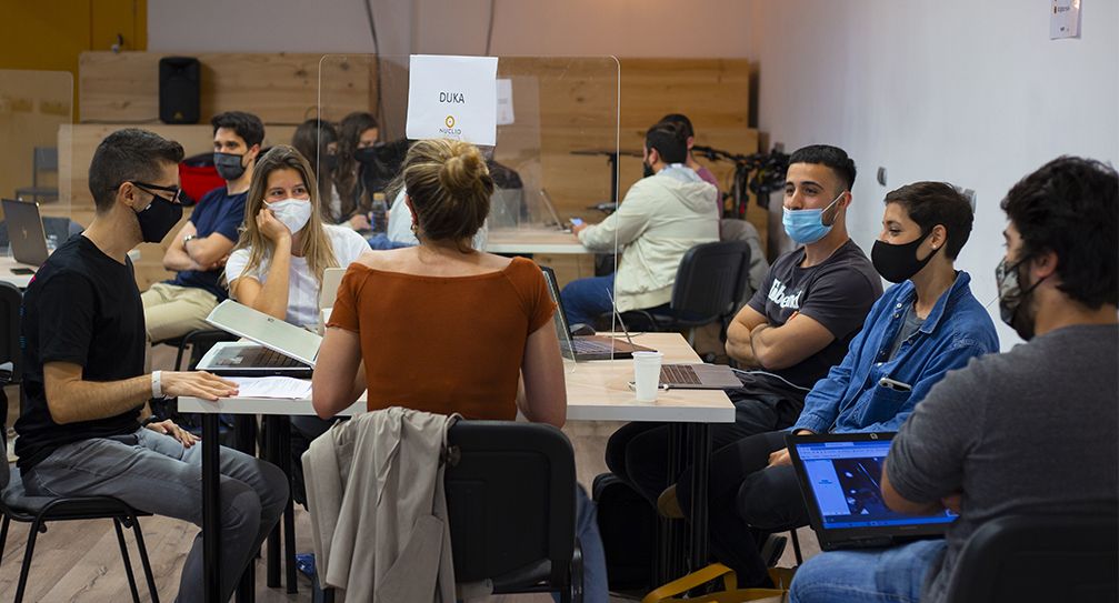 El equipo de Duka estaba formado por 5 personas. Un programador, un especialista en efectos visuales, un ilustrador digital, un experto en Marketing y un licenciado en Turismo y Hostelería. El proyecto se realizó de forma presencial, y aunque había personas con más conocimientos, nos repartimos las tareas equitativamente para poder aprender lo máximo posible todo el proceso de Design Thinking.